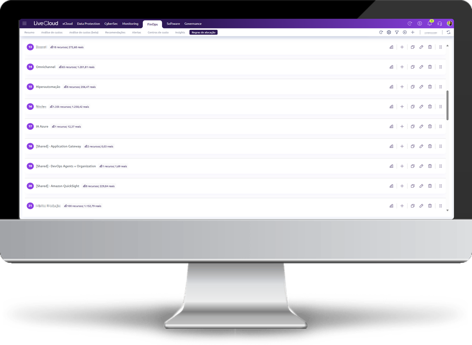 - Gestão financeira multicloud: faça a gestão financeira das nuvens de um ambiente multicloud de forma centralizada, otimizando custos, tempo e aprimorando a governança de seus ativos.