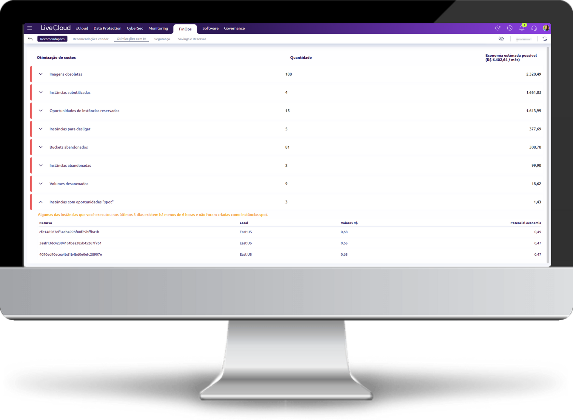 Receba recomendações avançadas para otimizar custos, de acordo com o uso de seus recursos de nuvem. Veja otimizações com economia estimada possível em instâncias subutilizadas, reservadas, abandonadas, possíveis de desligamento e com oportunidade de spot, além de buckets abandonados, imagens e IPs obsoletos.