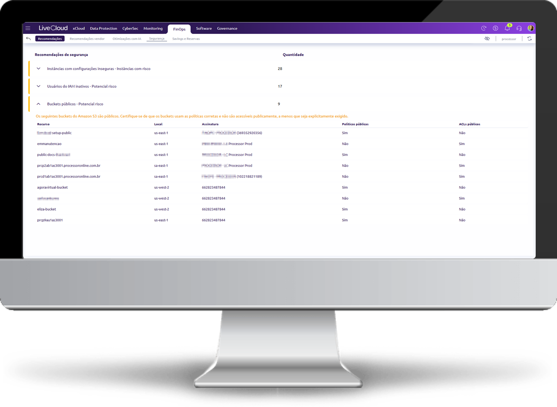 Veja uma série de recomendações para ampliar a segurança digital do ambiente, como instâncias em risco com configurações inseguras, usuários do IAM inativos e buckets públicos com potencial risco.